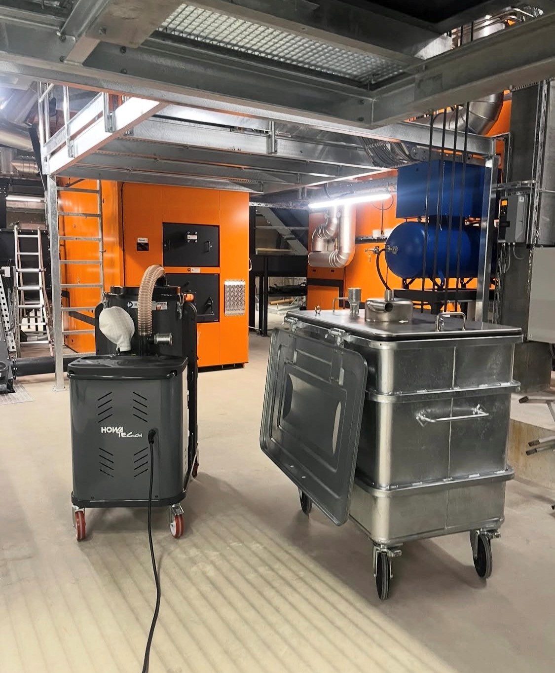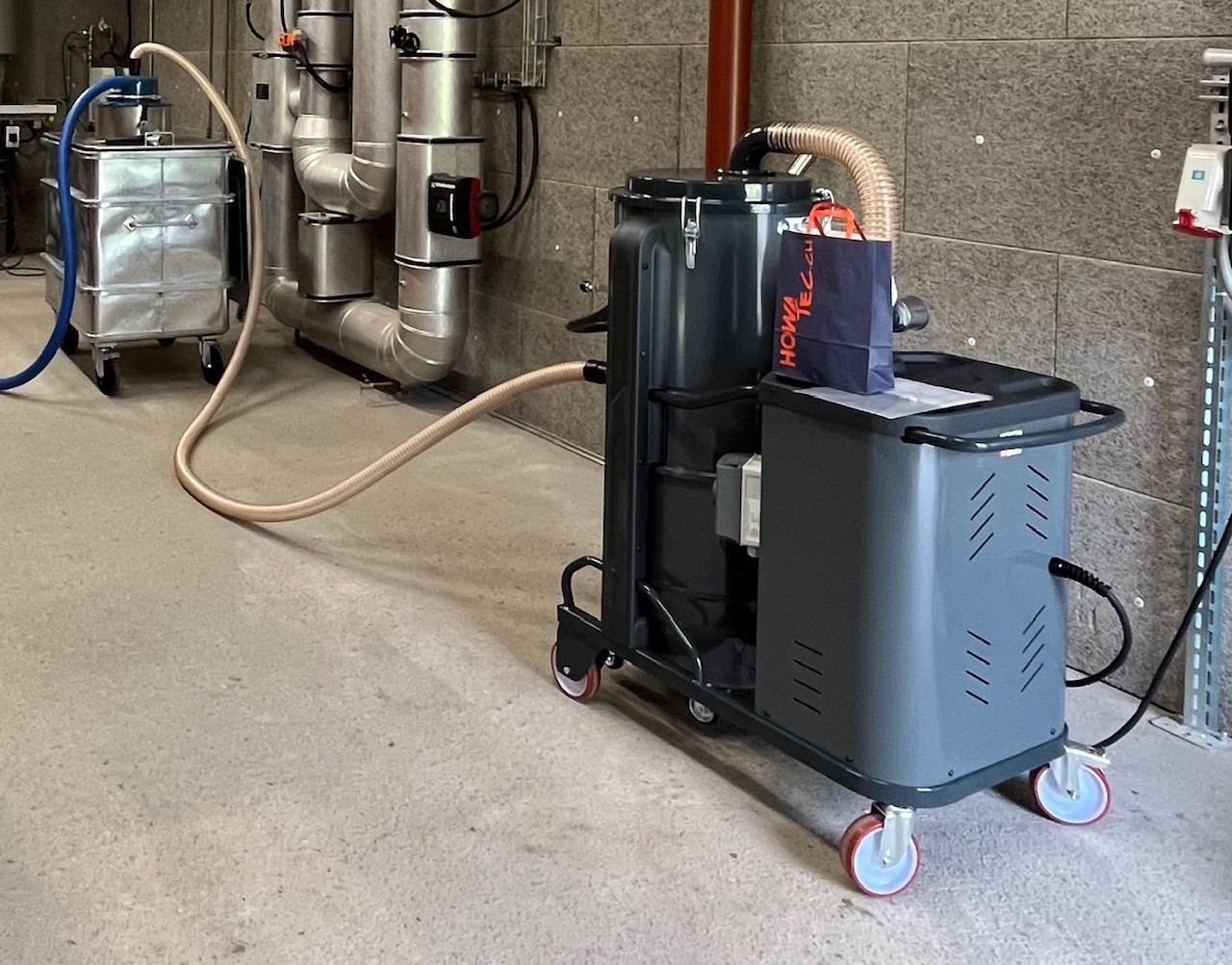 Drehstrom-Industriesauger, robust und mobil. Motor geeignet für Dauerbetrieb rund um die Uhr, wartungsfrei. Gleichzeitiges Ansaugen von Feststoffen, Stäuben und Flüssigkeiten. Die Filterabreinigung ist manuell über einen Filterrüttler. Ideal als Antriebseinheit für kleinere Zentralsauginstallationen oder auch als Aschesauger für grosse Container.