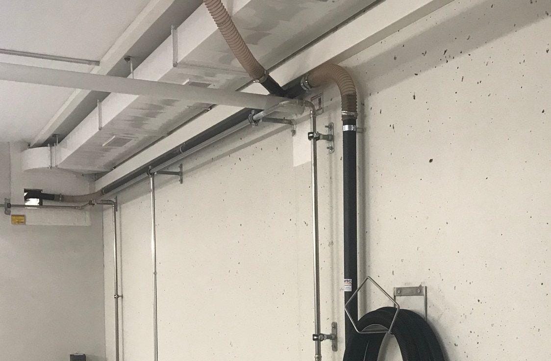 Durch die Montage der Saugturbine in einen Technikraum oder in die Höhe besteht nie mehr Gefahr, dass der Sauger an den Autos Beschädigungen macht, im Raum befinden sich nur Schläuche. Dies hemmt auch den Lärmpegel auf ein Minimum!