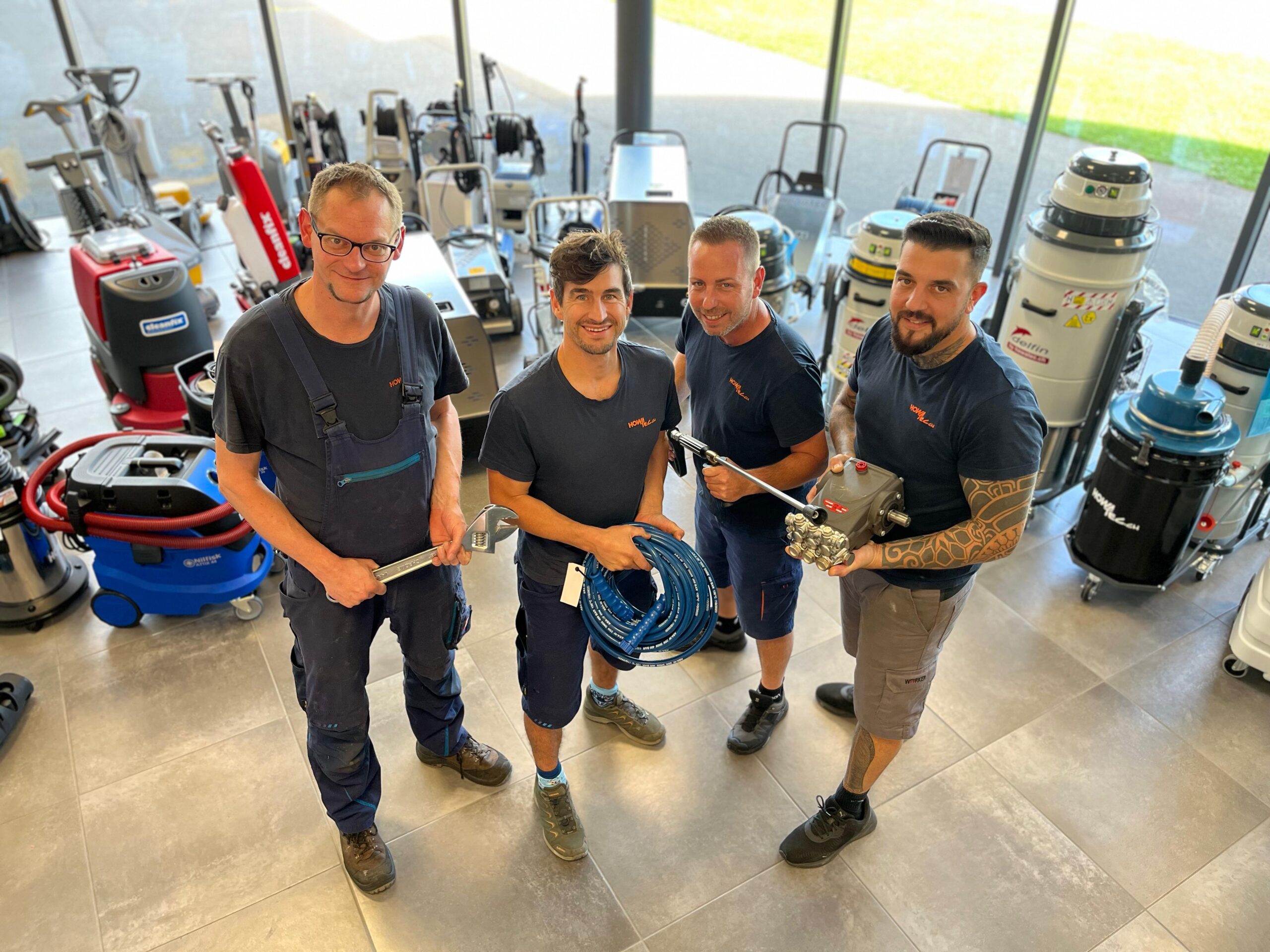 Wir als Team mit mehr als zwanzig Jahren Berufserfahrung im Bereich Hochdruck- und Reinigungstechnologie versuchen jeden Tag, die besten Produkte für Sie als Kunden zu Installieren und Reparieren. Die gut ausgerüstete Werkstatt und der komplett ausgestattete Servicebus garantieren schnelle und effiziente Reparaturen bei uns oder bei Ihnen vor Ort. Für eine Produktevorstellung werden Sie bei uns im Showroom fündig, auch können wir Maschinen in der Werkstatt zum Test aufbauen, damit Sie sich ein Bild der Qualität und Leistung machen können. Auch Ersatzteile wie Hochdruckschläuche, Ventile, Dichtungen, Pumpen und Motoren sind bei uns ab Lager verfügbar und werden gerne von unserem Team gezeigt.